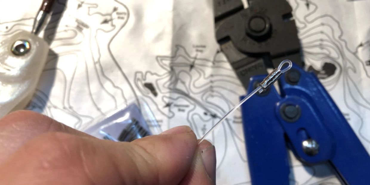 Insert the fluorocarbon into a split ring/ treble hook and close the loop in the sleeve. For the Citizen 6, we used Owner size 1 ST36-BC hooks and size 6 hyper wire split rings.